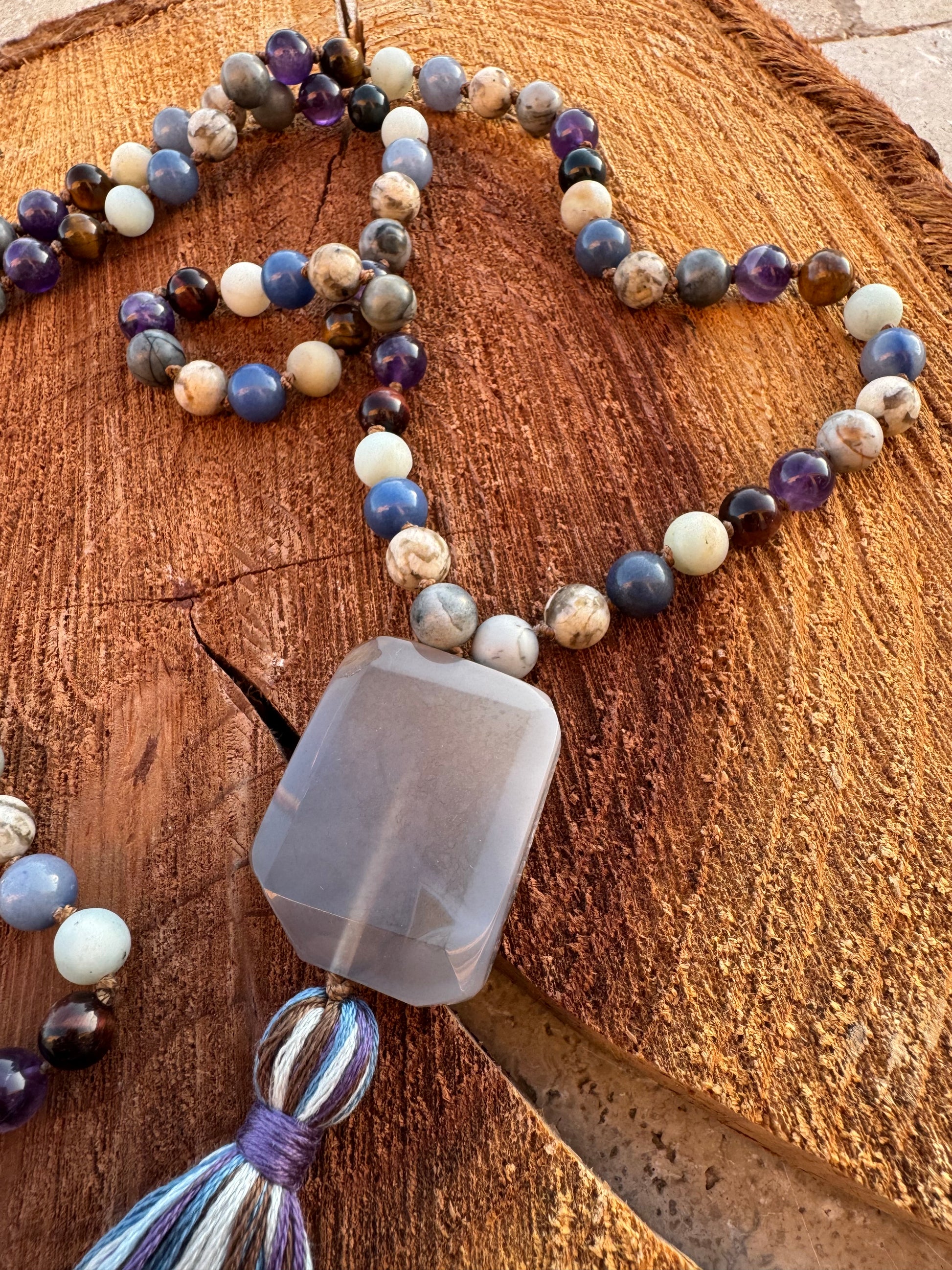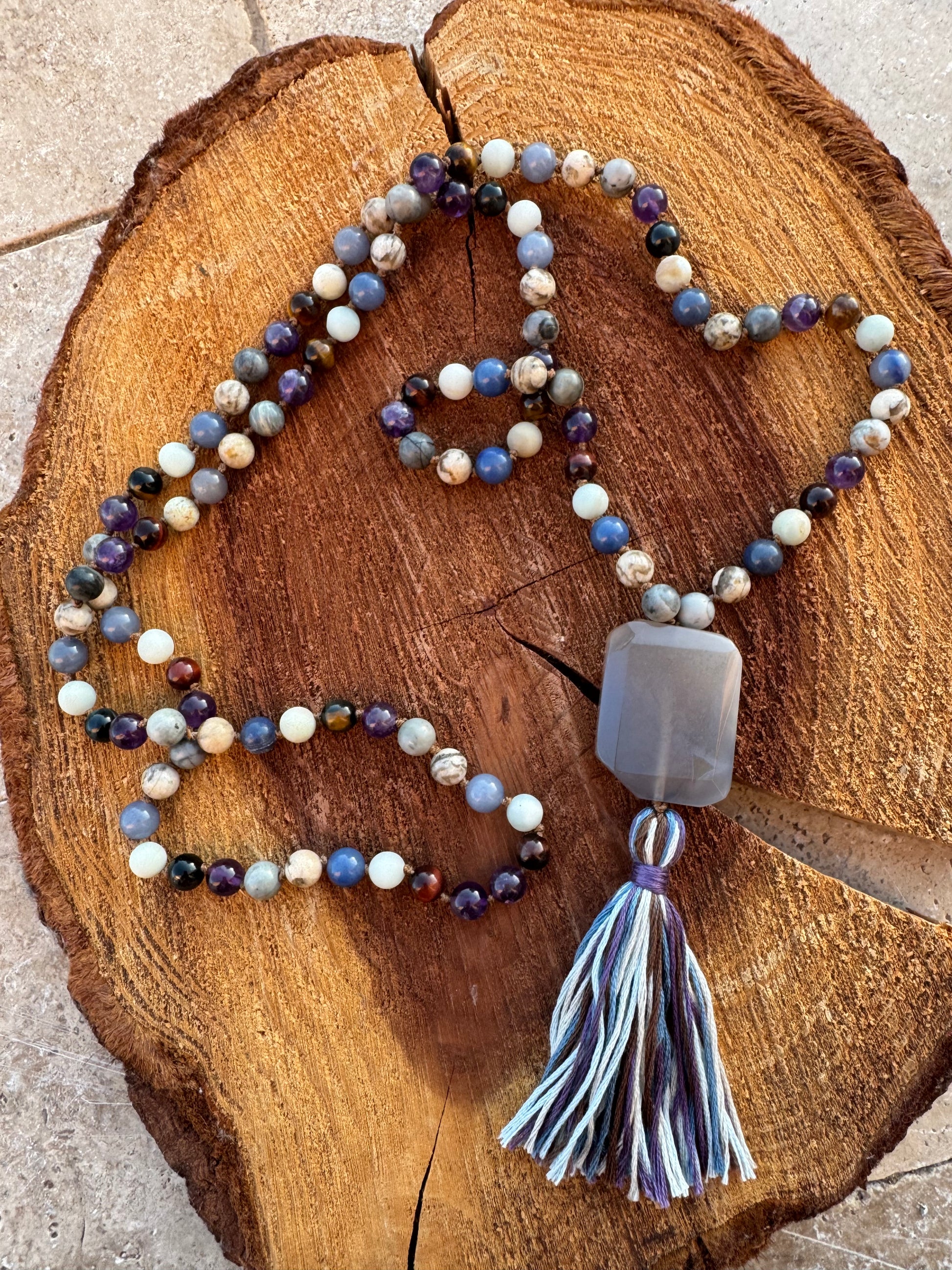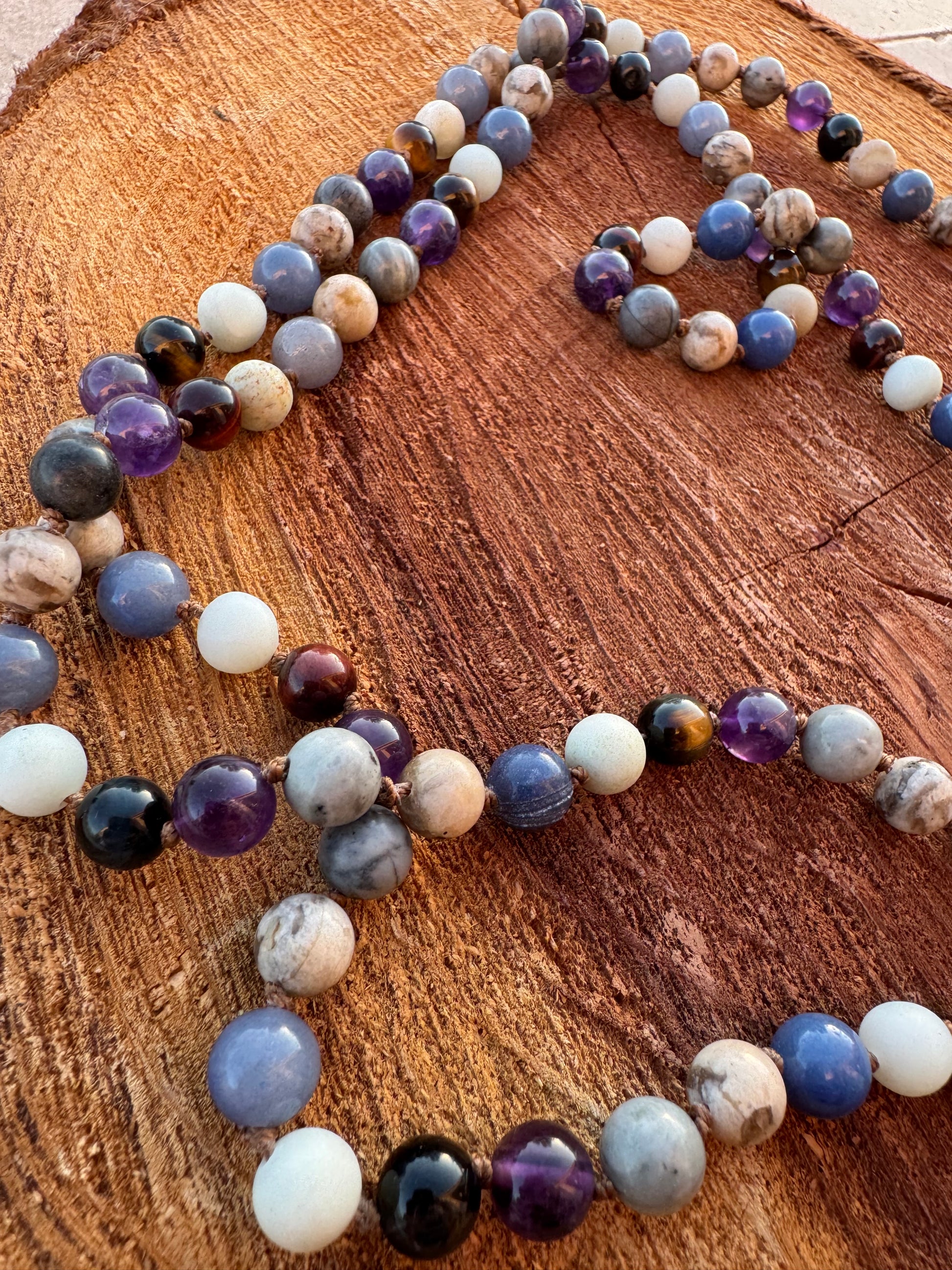 Crafted from a harmonious blend of Amethyst, Mixed Tiger Eye, Amazonite, Blue Aventurine, Feldspar, and Picasso Jasper, this piece weaves together calming intuition, courageous self-expression, and deep inner strength. Each bead supports a unique facet of your spiritual path: