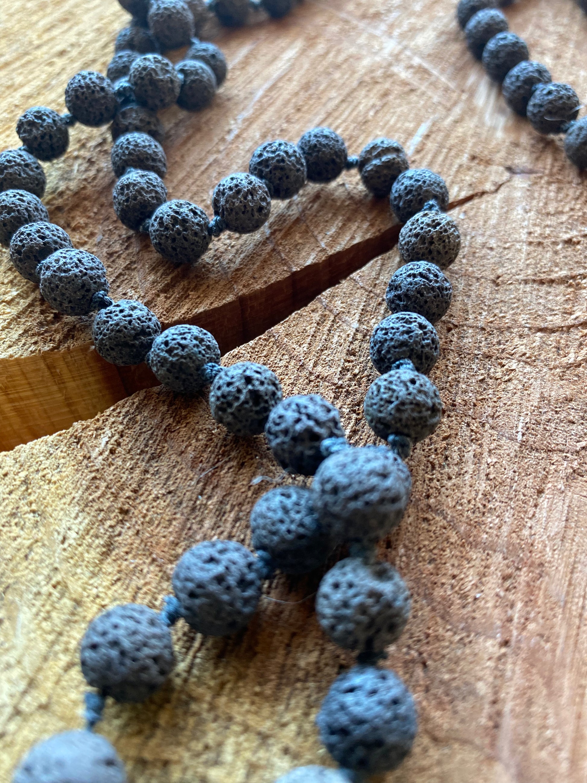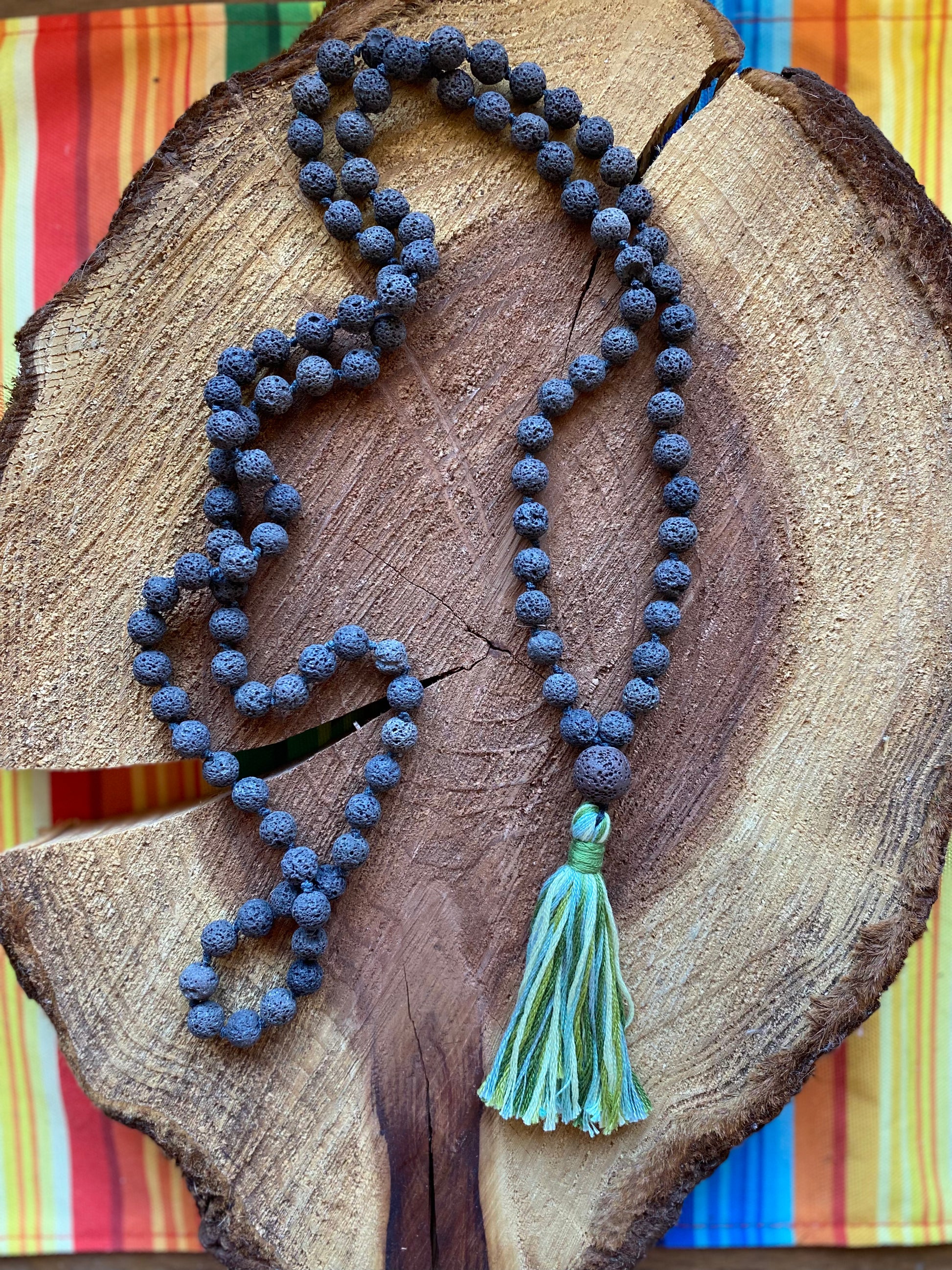 Created with 108 lava beads perfect for infusing your favorite essential oil blend. Handmade colorful tassel.