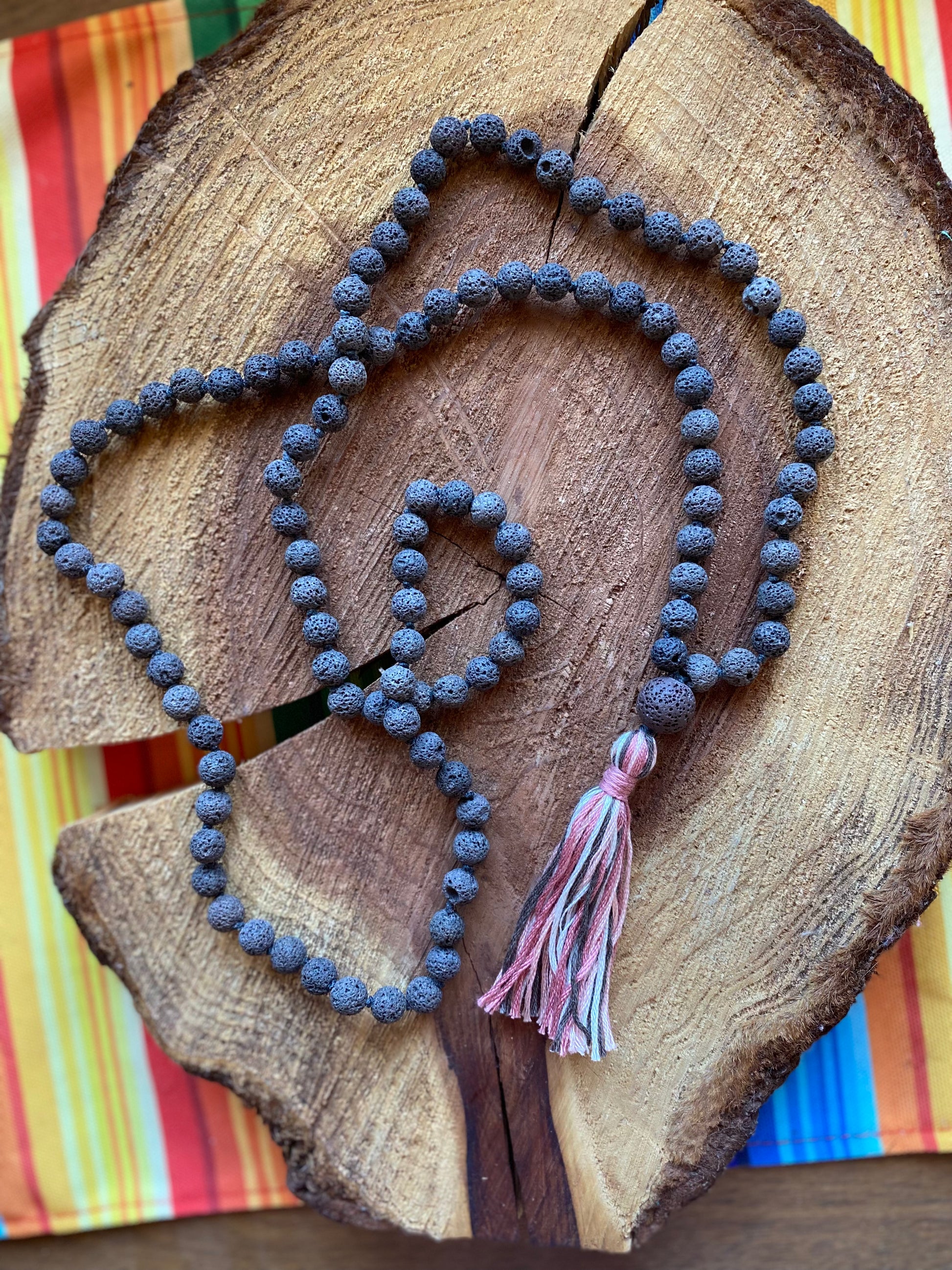 Created with 108 lava beads perfect for infusing your favorite essential oil blend. Handmade colorful tassel.