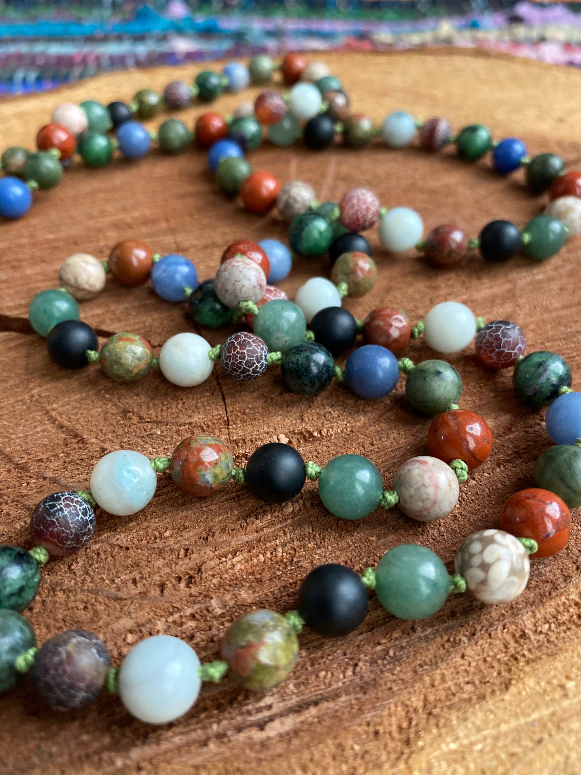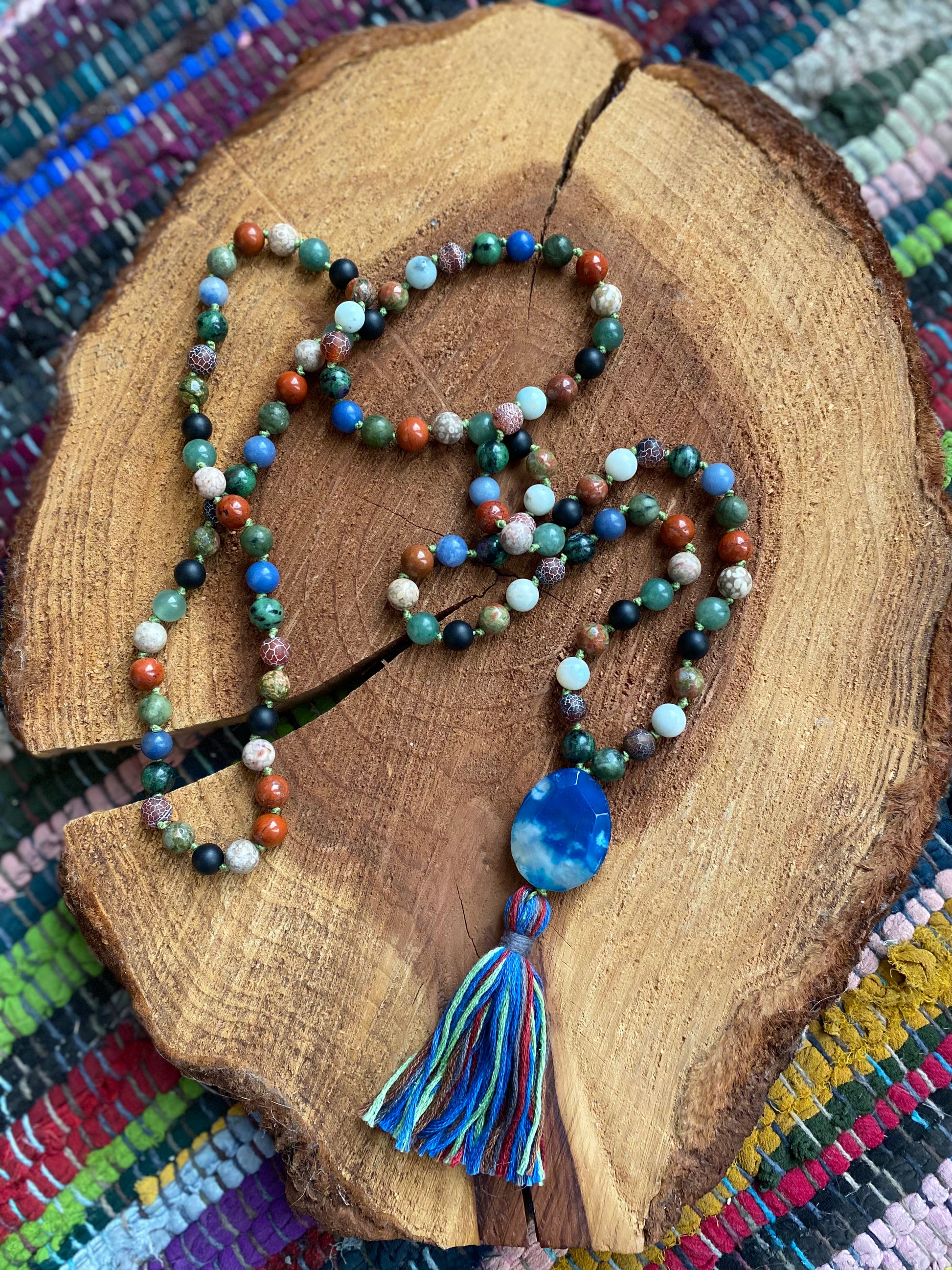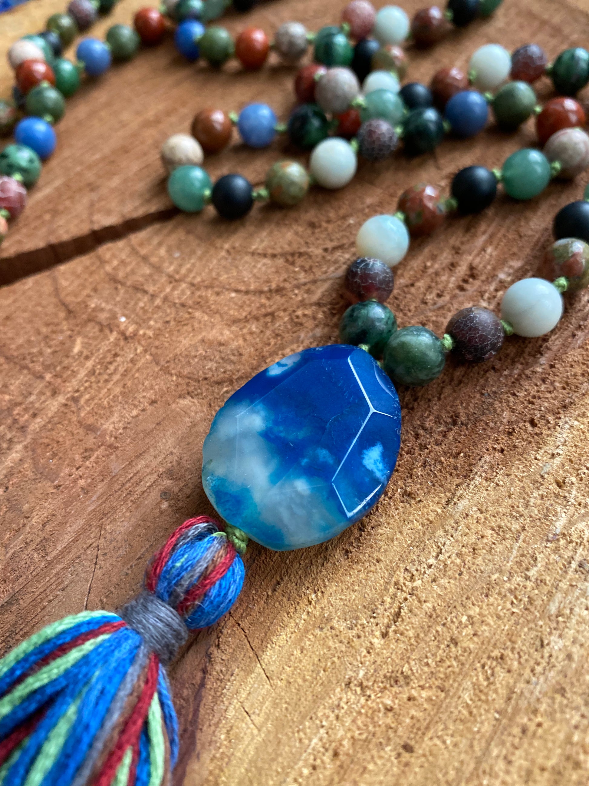 Created using Black Jade, Unakite, Green Aventurine, Blue Aventurine, amazonite, Ruby in Zoisite, Maifan stone and Red Jasper, with a Blue Fire Agate Guru bead.